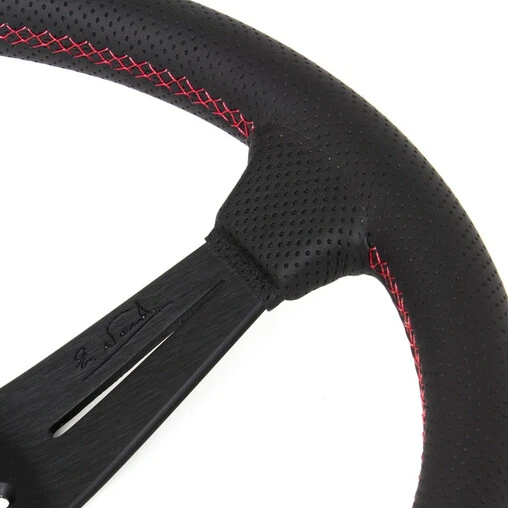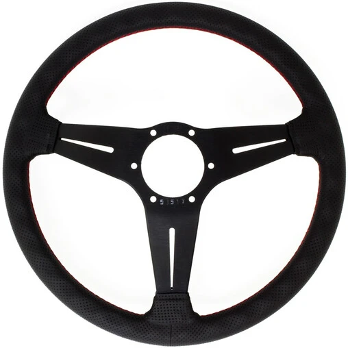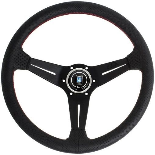 Nardi Deep Corn Steering Wheel, Black Perforated Leather, Black Spokes, Red Stitching, 80 mm Dish, Ø35 cm Specifications