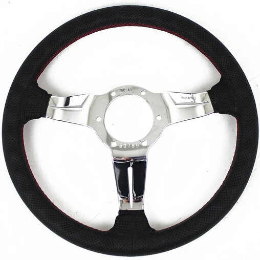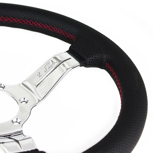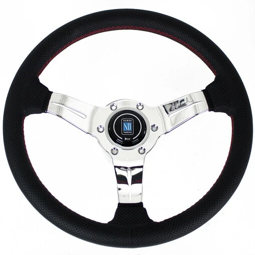 Nardi Deep Corn Steering Wheel, Black Perforated Leather, Chrome Spokes, Red Stitching, 35 mm Dish, Ø33 cm Specifications